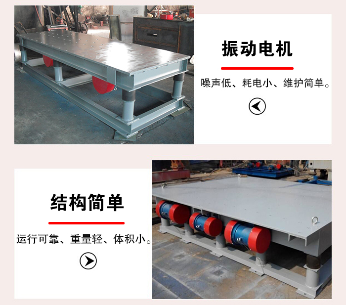 振實(shí)臺(tái)在使用過程中,可以通過調(diào)節(jié)振動(dòng)電機(jī)激振力大小、來使平臺(tái)上物料實(shí)現(xiàn)理想的形式。振動(dòng)電機(jī)為激振源,噪聲低、耗電小、維護(hù)簡單。ZDP振實(shí)臺(tái)結(jié)構(gòu)簡單。運(yùn)行可靠、重量輕、體積小、安裝簡便。